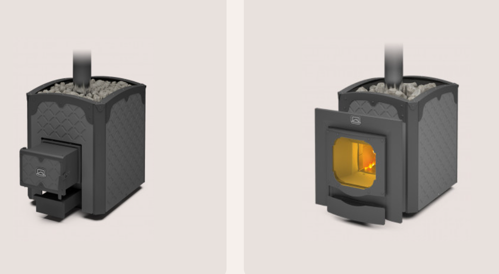 Данная печь также не имеет острых углов. Такой внешний вид позволяет более равномерно распределять выделяемое тепло. Представлено 2 модели от производителя: с открытой и закрытой каменкой. Если необходима именно русская баня с повышенной влажностью воздуха, лучше ограничиться закрытым типом. Однако, если есть желание посмотреть на камни вживую и плескать на них воду, придется устанавливать дополнительные инструменты для повышения влажности воздуха и придачи пару легкости.