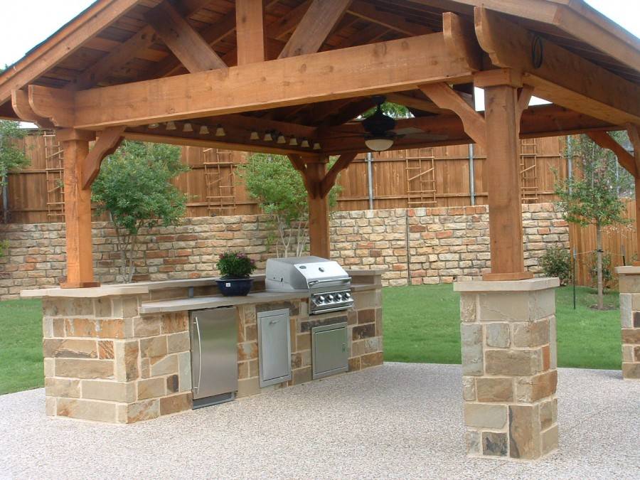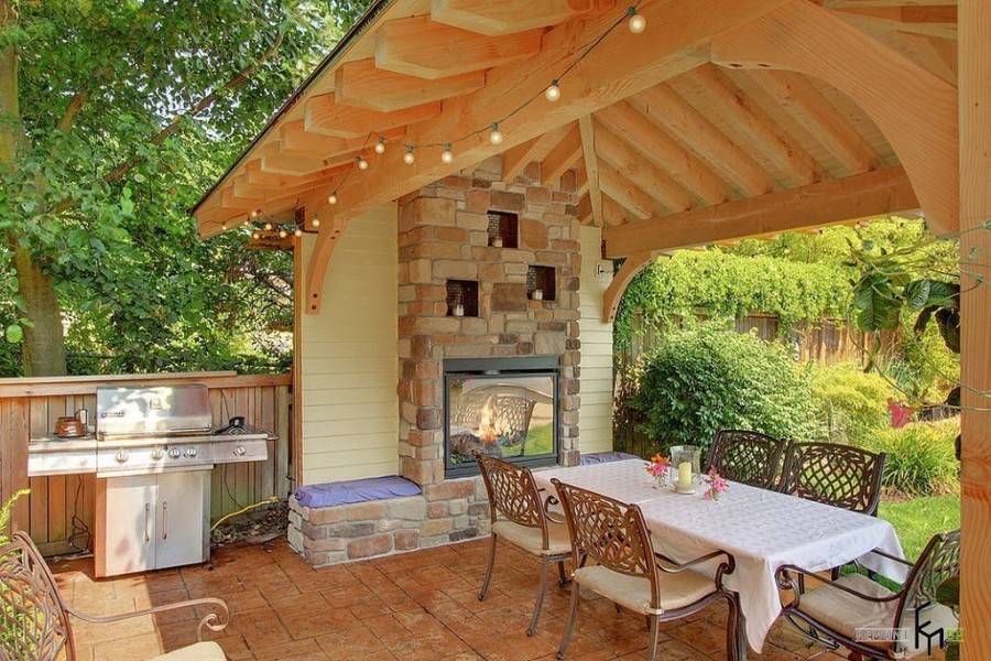 После того, как Вы закончите со строительством основной части, можно сделать столешницу для удобной подготовки, разделки и дальнейшего хранения продуктов. Также будет к месту и раковина. Установить рядом беседку или, возможно, большой деревянный стол и скамьи.