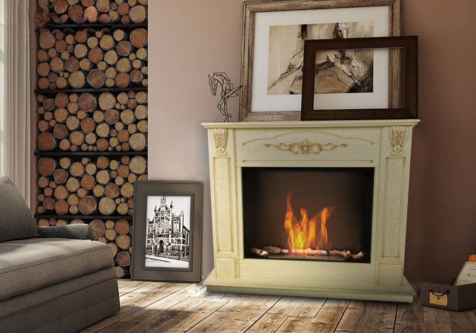 Напольная конструкция вписывается в любой интерьер, так как имитирует дровяные камины