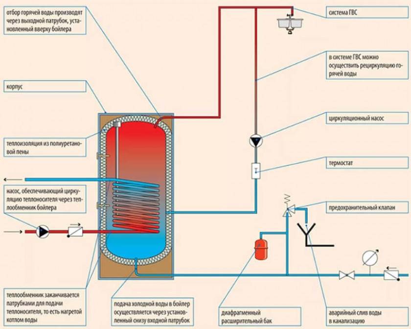 В конструкцию и комплектацию агрегата входят: корпус, состоящий из внешнего кожуха, утеплителя и внутреннего бака; змеевик-теплообменник, магниевый анод и рециркуляционный патрубок; подвод/отвод для холодной/горячей воды и вход/выход для циркулирующего теплоносителя; насос, термометр, термостат, сливной кран, водный фильтр и трехходовой клапан; группа безопасности и блок управления. Крепится прибор вертикально в непосредственной близости от котла в специально предусмотренном помещении: объемом ≤ 200 л к капитальной стене, емкостью ˃ 200 л – к полу.