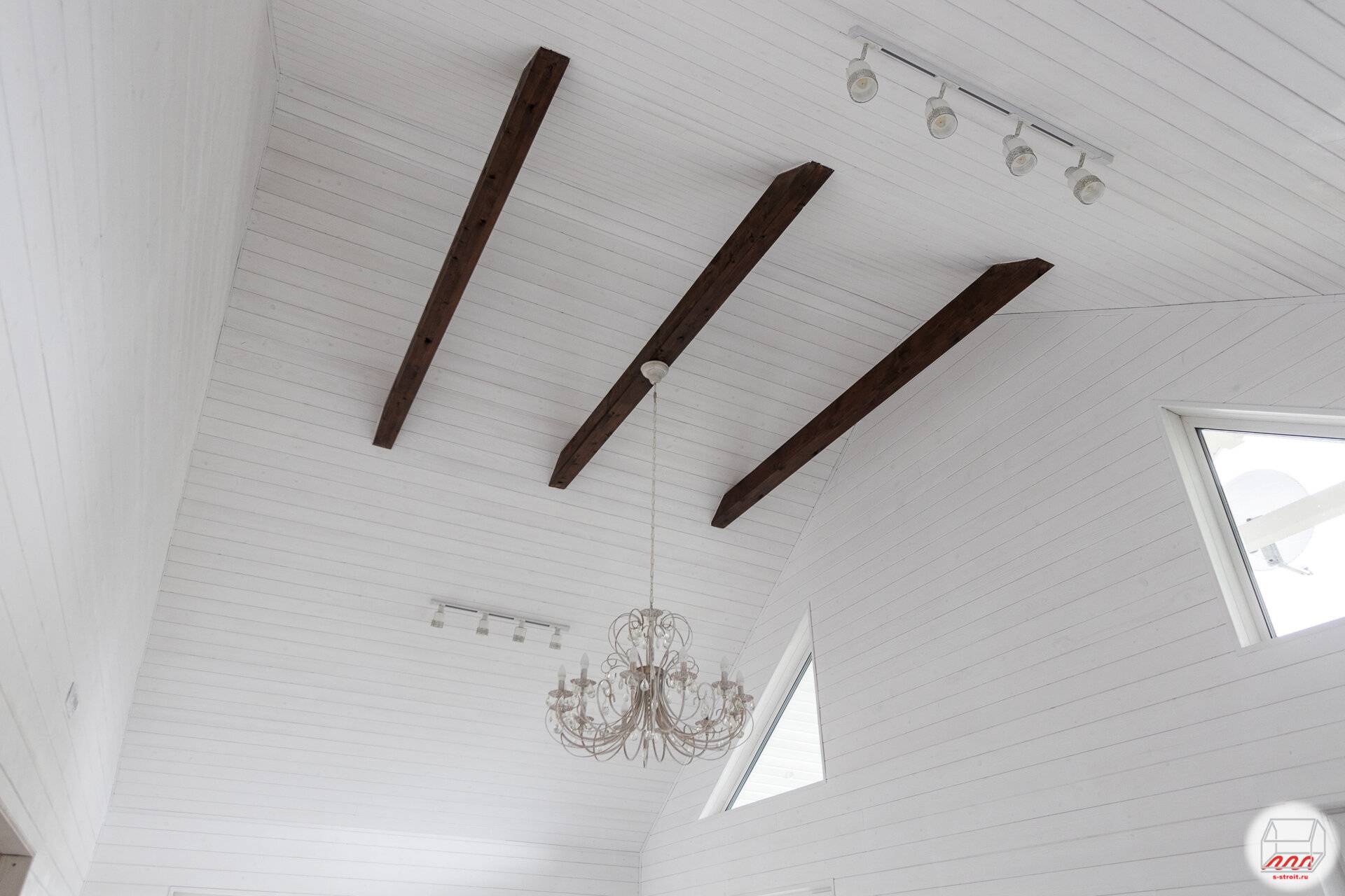 - Отделка потолка. Производится пошивка чернового потолка досками 25 мм, которые укладываются сплошным или разреженным способом. Затем выполняется обшивка потолка вагонкой, блокхаусом или имитацией бруса. Потолок можно просто оставить в изначальном виде, отшлифовав и покрыв лакокрасочными составами.