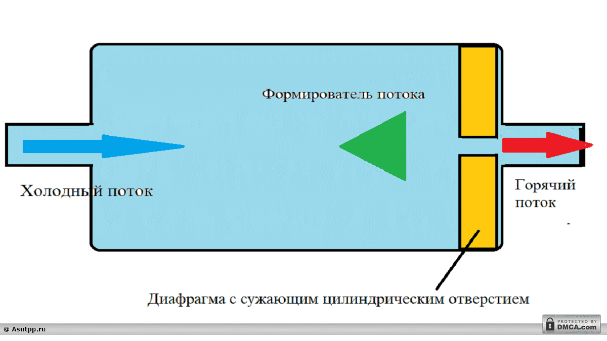 Показанный на схеме принцип работы вихревой трубы несложен — поток проходит через камеру закрутки, где разбивается на два потока с разной температурой