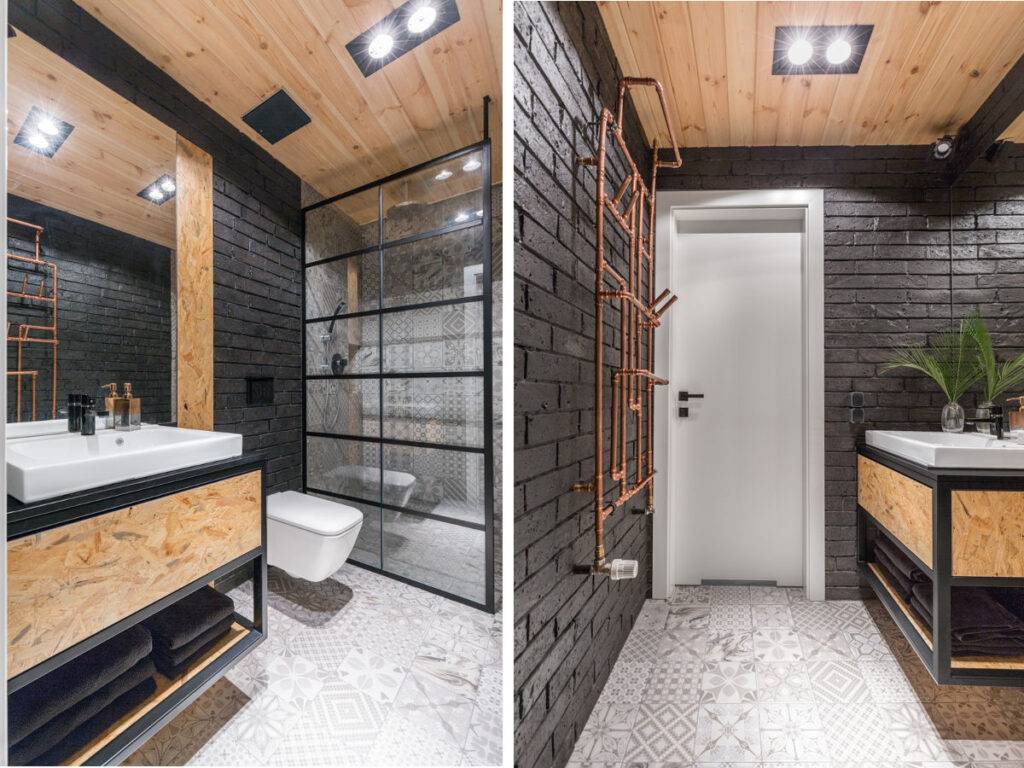 Фон выполнен из нежной плитки, имитирующей бетон . В выбранных зонах плитка расположена вертикально: темно-синий глянец в умывальнике, белый в душе. Черные детали объединяют дизайн, делая его гармоничным.