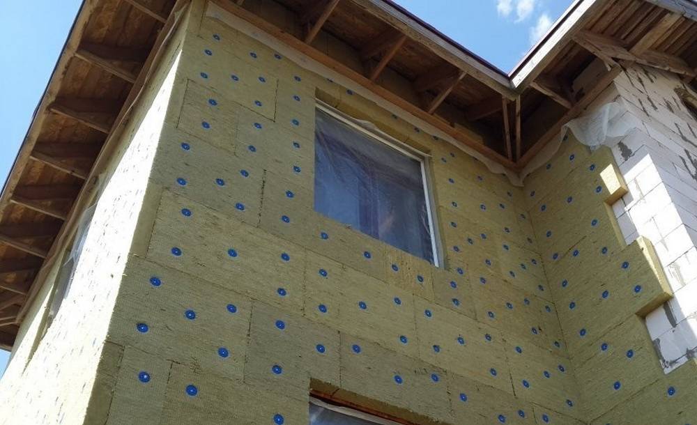 - Сначала монтируется утеплитель на стены на клей и фасадные дюбеля.