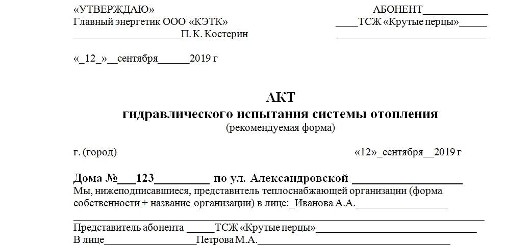 Приведенные бланк и образец являются примером, рекомендуемой формой для составления акта, но никак не обязательным для всех документом. Возможно, в некоторых случаях более удобными будут другие варианты фиксации проводимых работ по проверке коммунальных систем. К слову, также, путем гидравлического испытания, проверяется система горячего водоснабжения.