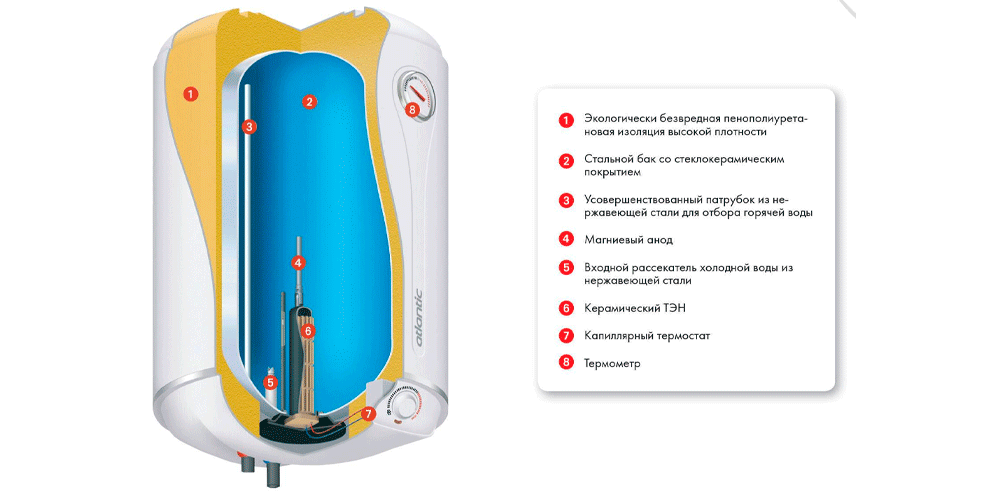 При производстве итальянских водонагревателей Ariston применяются медные сплавы и хромоникелевая спираль. Гнутый элемент устанавливается на латунном фланце, повышающем теплоотдачу. Терморегулятор позволяет настраивать оптимальный уровень температуры, но не выше 85оС градусов. После достижения необходимых температурных показателей, происходит автоматическое отключение, а после падение уровня температуры на 5оС бойлер начинает нагрев.