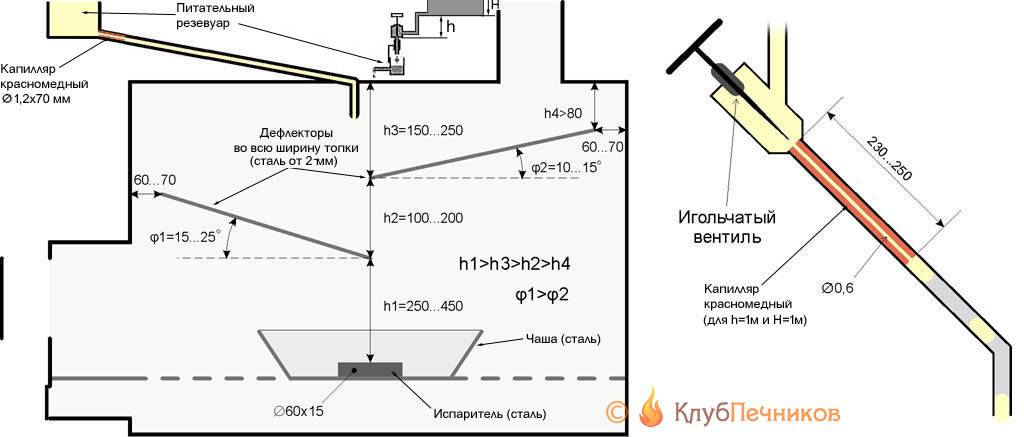 Схема доработки буржуйки под дизтопливо дана на рис. ниже. Дефлекторы не дают парам горючего остыть, прежде чем те сгорят. Кстати, дефлекторы увеличивают экономичность печи при запуске на дровах и угле. Высота бортика пламенной чаши – 60-80 мм; емкость ее не должна быть меньше емкости питательного резервуара (см. ниже). Ход печи на жидком топливе, если можно так выразиться, обратный: воздух поступает в настежь открытую дверцу топливника; поддувало закрыто. В противном случае печка становится прожорливой и быстро закоксовывается (обрастает нагаром).