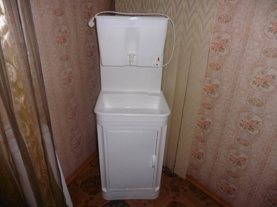 А остальное, как говорится, дело техники, и сборка умывальника – дело не сложное. Сначала нужно закрепить на тумбе раковину, потом установить бачок, предварительно вкрутив в него кран и при необходимости нагревательный элемент, который можно свободно приобрести на рынке (такие элементы применяются в накопительных водонагревательных баках). Ну и, естественно, нужно будет правильно подключить такой нагреватель к сети электропитания – его лучше заземлить, чтобы случайно никого током не ударило.