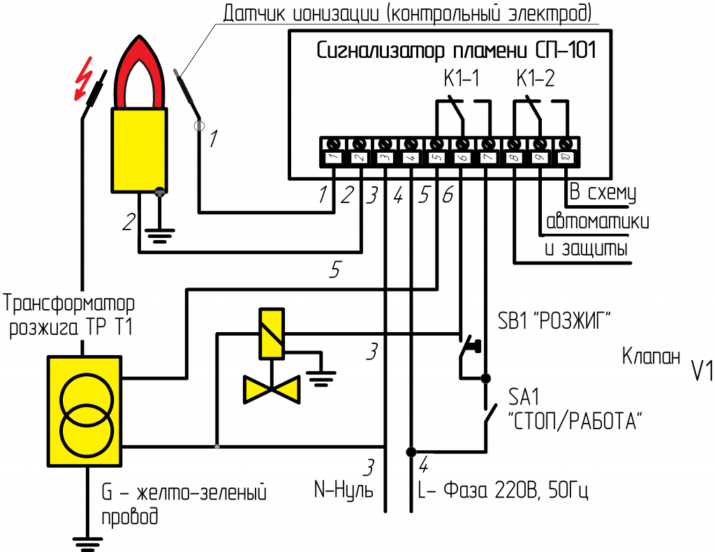 Что касается выходного сигнала датчика контроля пламени СЛ-90-1Е, то это не только светодиодная индикация, но и контакты реле «сухого» типа. Максимальная коммутационная мощность данных контактов составляет 100 Вт. Наличие этих двух выходных систем позволяет использовать приспособление этого типа практически в любой системе управления автоматического типа.
