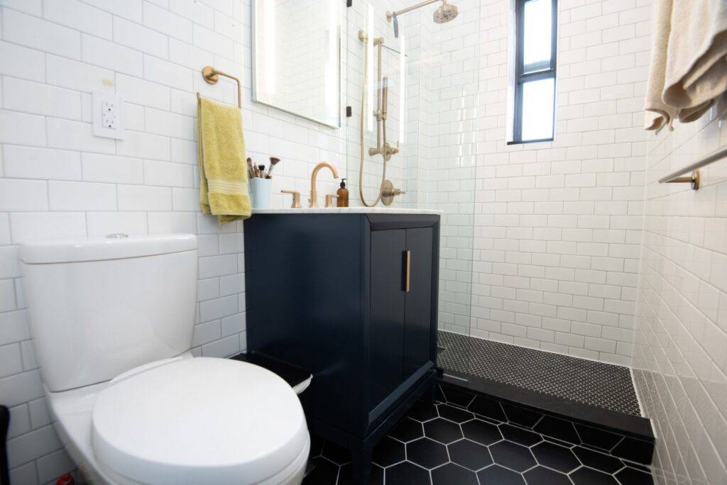 Важным элементом ванной комнаты в стиле нью-йорк является правильно подобранная плитка, которая поможет вам создать желаемую атмосферу в комнате. Черно-белая шахматная доска на полу идеально подойдет, а также мрамор. Также приветствуются витиеватые мозаики. Незаменимый элемент эстетики Нью-Йорка — декоративные планки и лепнина.