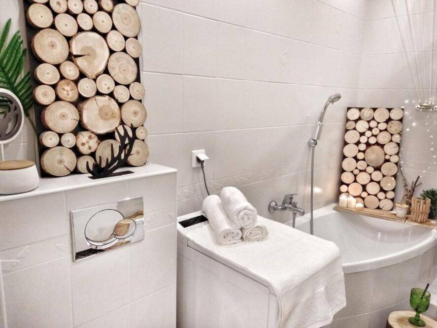 Незаменимым элементом интерьера, выдержанного в этом стиле, является дерево (желательно с сучками и дефектами или отбеленное), а также другие натуральные материалы, такие как лен, шерсть, камень или плетение. Если вас не совсем убедило использование дерева в помещениях с повышенной влажностью, можно выбрать модную плитку под дерево.