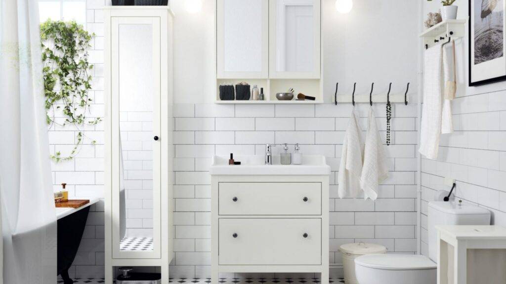 Шкафы рекомендуется располагать симметрично по обе стороны от окна, двери или раковины. Тумба для ванной комнаты внешне похожая как на комод, так и на туалетный столик, обычно состоит из нескольких отделений, достаточно просторных для того, чтобы скрыть там стиральную машину.