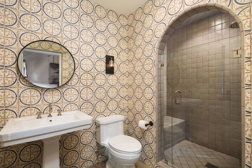 Узорчатая плитка — наиболее характерный элемент ванных комнат, оформленных в этом стиле. Если вас не убеждает разноцветный пэчворк, можно выбрать мозаику.