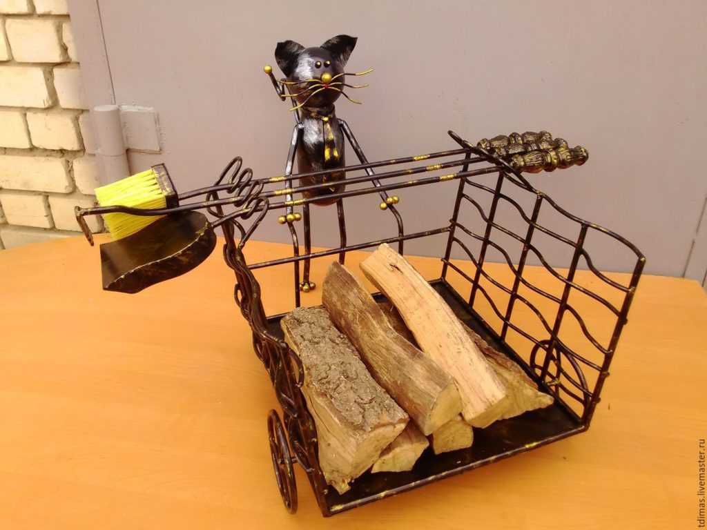 Небольшие декоративные элементы способны сделать из скучного и простого предмета, оригинальную и красивую вещь. Металлическая дровница для камина. Для изготовления данной модели потребуются металлические прутья, болгарка, сварочный аппарат. Отрезают четыре равных по длине прута (30-40 см) и сваривают из них квадрат. Затем к полученному квадратному основанию приваривают боковины длиной 1,5м. металлически каркас обшивают листом металла или другим материалом на свой вкус.