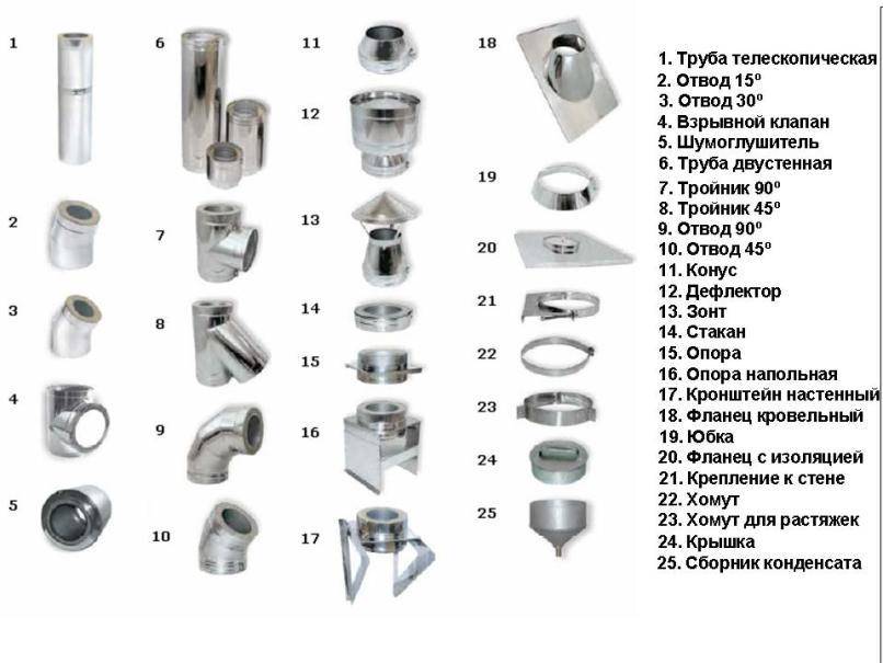 Для монтажа дымохода понадобится следующие детали: