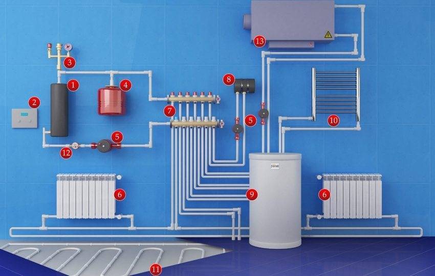 Типовая схема подключения: 1 — электрический котел; 2 — система управления; 3 — группа безопасности; 4 — расширительный бак; 5 — циркуляционные насосы; 6 — радиаторы; 7 — распределительная гребенка; 8 — теплообменник (для бассейна); 9 — бойлер косвенного нагрева; 10 — полотенцесушитель; 11 — теплый пол; 12 — счетчик воды; 13 — приточная вентиляционная установка