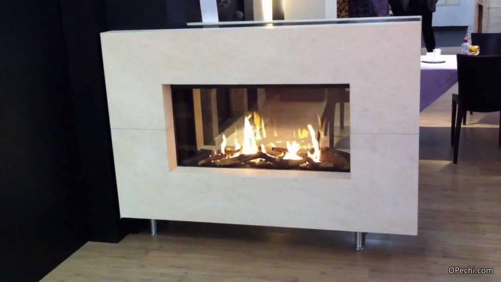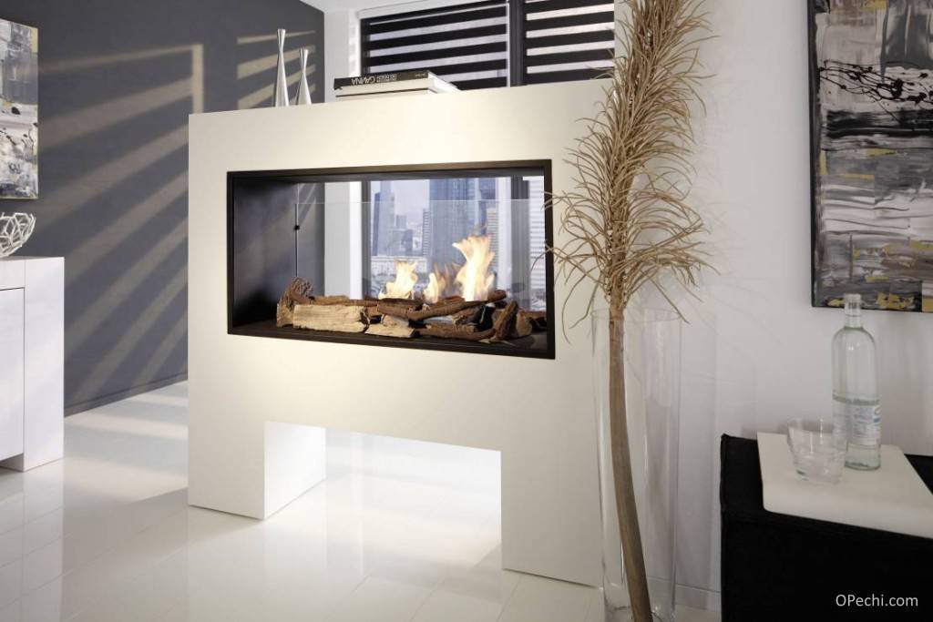 Возможность созерцать огонь из одного устройства из 2-х разных помещений реализована в двусторонней модификации. Ее индивидуальностью являются застекленные стены топочного пространства. Подобные варианты монтируются в стену здания, разделяющую помещения на зоны. Ширина такой стенки соответствует топочному размеру, в связи, с чем подобную конструкцию камина выбирают еще до возведения дома. Кроме вышеназванных конструкций каминов существуют варианты с открытой и закрытой топкой, а также работающие на сжиженном или магистральном газе.