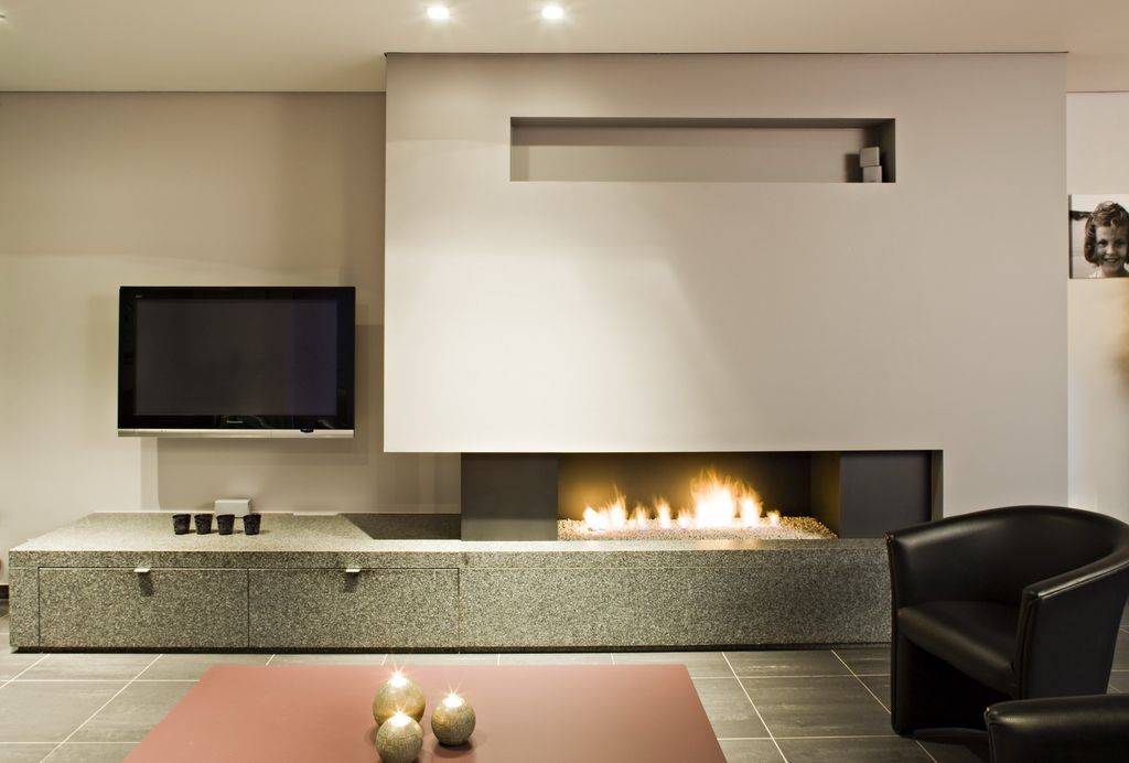 Встраиваемая топка дарит строгому интерьеру нотку естественной гармонии