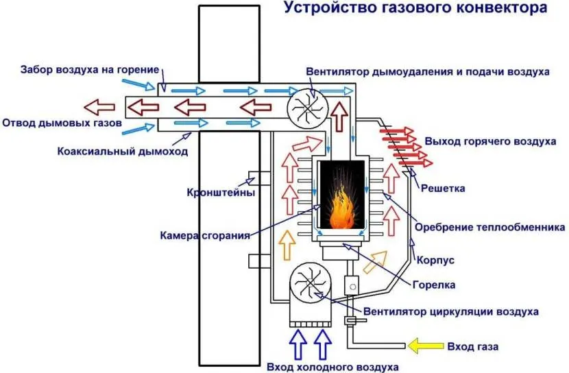 За нагрев теплообменника отвечает газ, поступающий в систему из баллонов или газовой центральной магистрали. При контакте с теплообменником массы воздуха нагреваются (становятся легче) и вытесняются холодными – это и есть принцип конвекции.