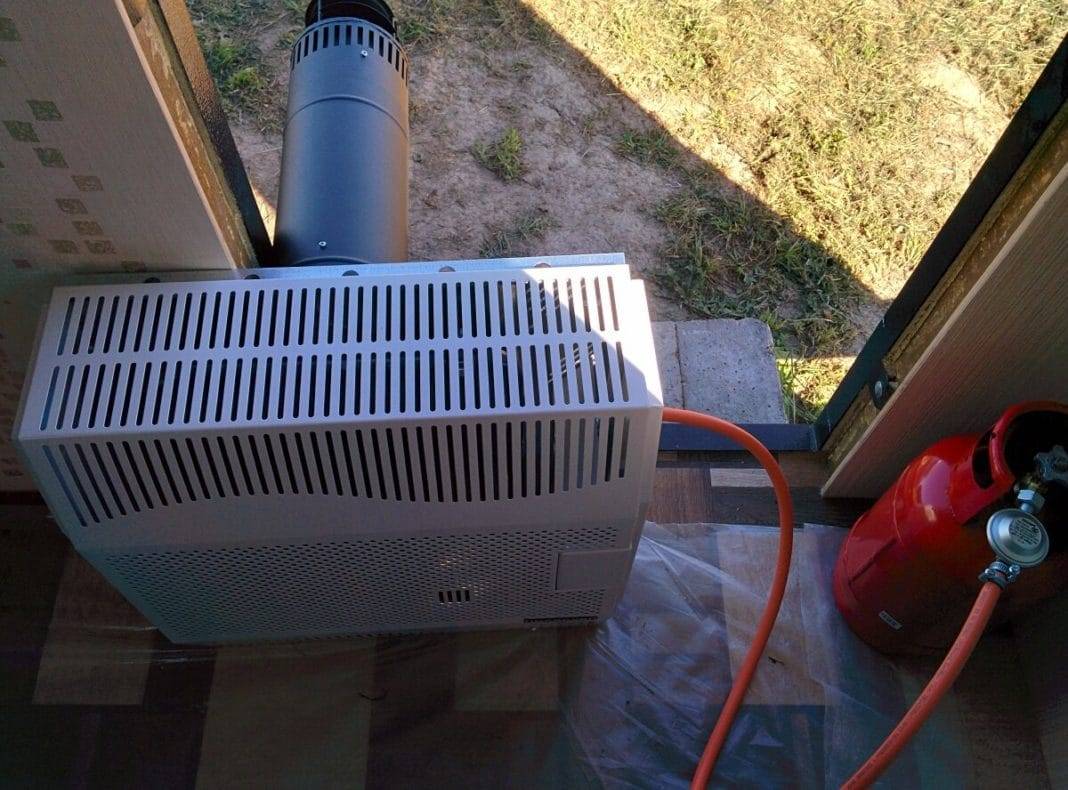 - У большинства моделей современных газовых обогревателей (конвекторов) воздух для поддержания горения идет с улицы. И туда же убираются продукты сгорания. При этом применяется не вентилятор, а труба в трубе, т.н. «коаксиальный воздуховод», который выводится через различное отверстие.