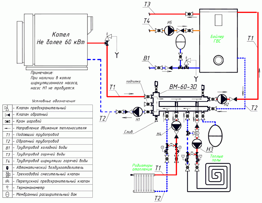 определенная схема применяется, если котел не обладает достаточной мощностью. При недостатке расхода требуется подмес охлажденного теплоносителя. При разнице температур срабатывают термодатчики;