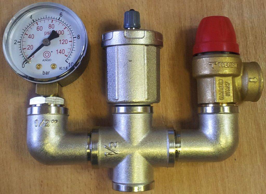 Правильно скомпонированная группа безопасности должна быть в форме тризубца, чтобы воздухоотводчик находился посередине, непосредственно над патрубком под группу безопасности.
