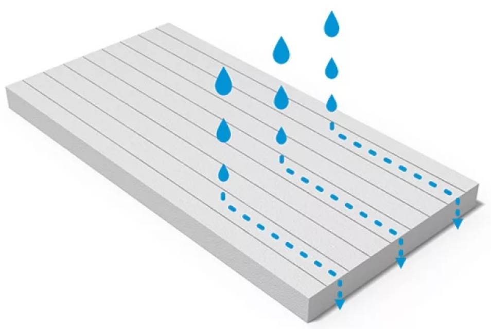 - Влагопроницаемость. При погружении плотного экструдированного пенополистирола в воду он остается практически сухим. Вбирает влаги в себя он лишь около 0,4%. Беспрессовый материал впитает примерно 4% воды. При контакте с жидкостью утеплитель не повреждается.