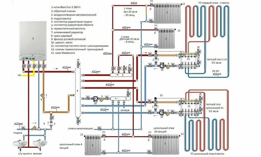 Схема с естественной и принудительной рециркуляцией, которые используются при отоплении двухэтажного частного дома