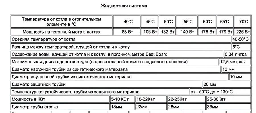 Пример технических характеристик теплого плинтуса Best Board для разных режимов работы системы