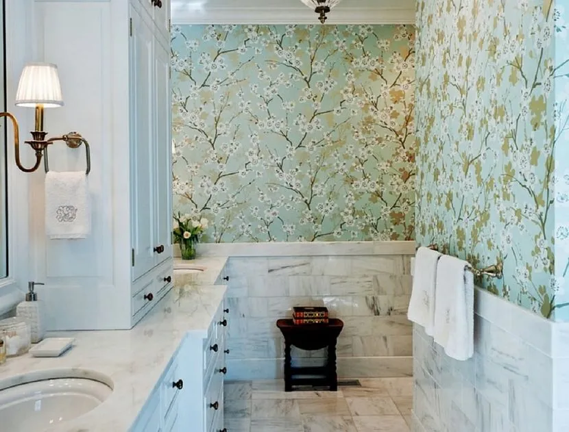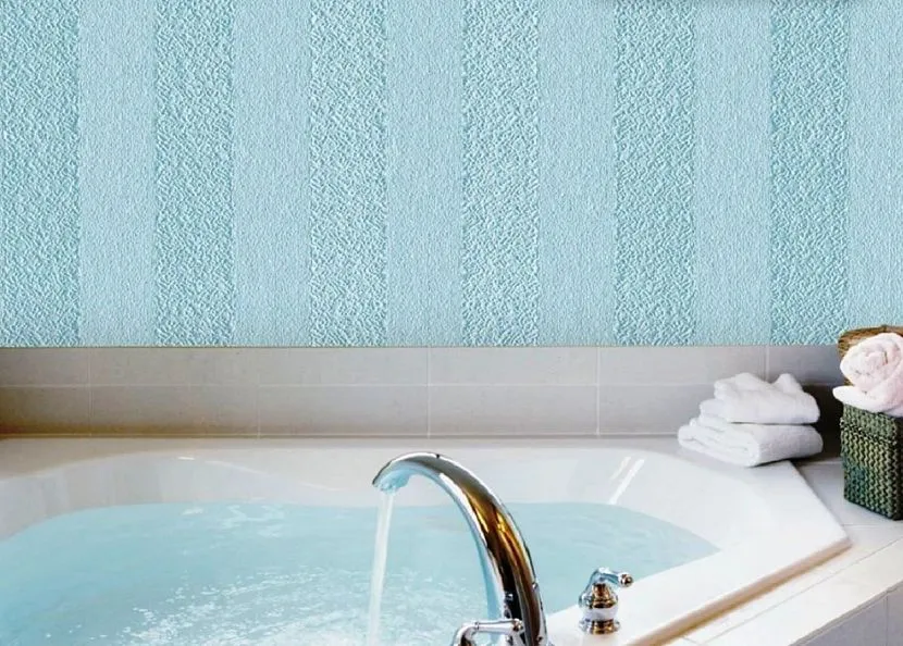 Для эксплуатации в ванной подходят шпалеры, имеющие максимальную маркировку устойчивости к влаге (3 волны). Среди популярных видов выделяют акриловые и виниловые обои. Модели не боятся влажного микроклимата, но не выдержат прямого попадания воды. Мокрую зону от разрушения спасет лакированная защита или панель из стекла. Оригинально смотрится чередование отделки с окрашиванием или декоративной штукатуркой по низу.