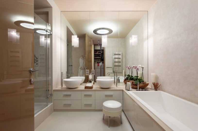 Если ванная достаточно большая, то в ней можно выделить и подсветить каждую зону отдельно – зону для умывания (умывальник и зеркало), для купания (ванна или душевая кабина), свободную зону (например, для стирки). В просторном помещении можно установить несколько потолочных светильников – хватит около шести. При выборе нескольких объектов освещения их размер и мощность может быть меньше, чем при наличии одного центрального.