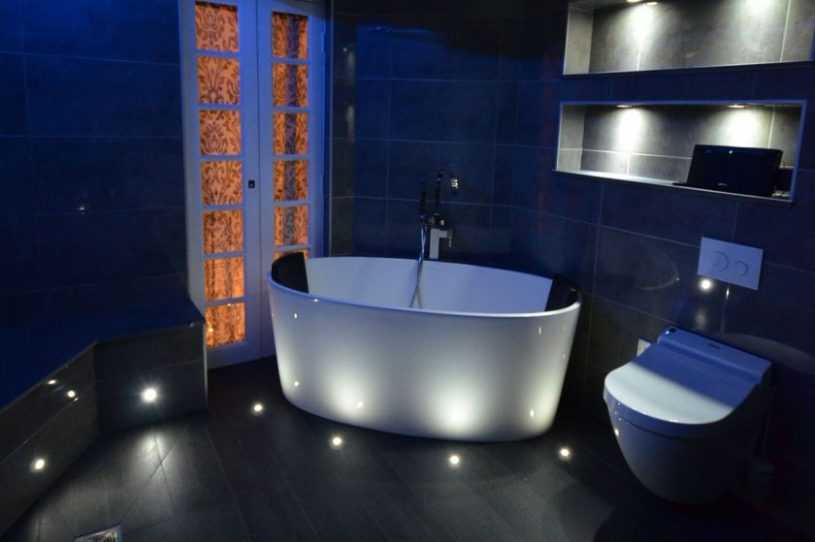 Если же ванная комната имеет большой размер и там установлено джакузи, то наилучший вариант – установка диодных ламп с нестандартными цветами. Такой свет не будет нарушать эстетику и внешний вид помещения.