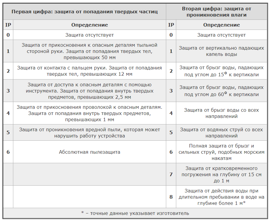 Существует международный стандарт, определяющий степени защиты электроустановок: International Protection — IP. После буквы IP следуют две цифры, характеризующие степень защиты. Типы маркировки указана на иллюстрации: