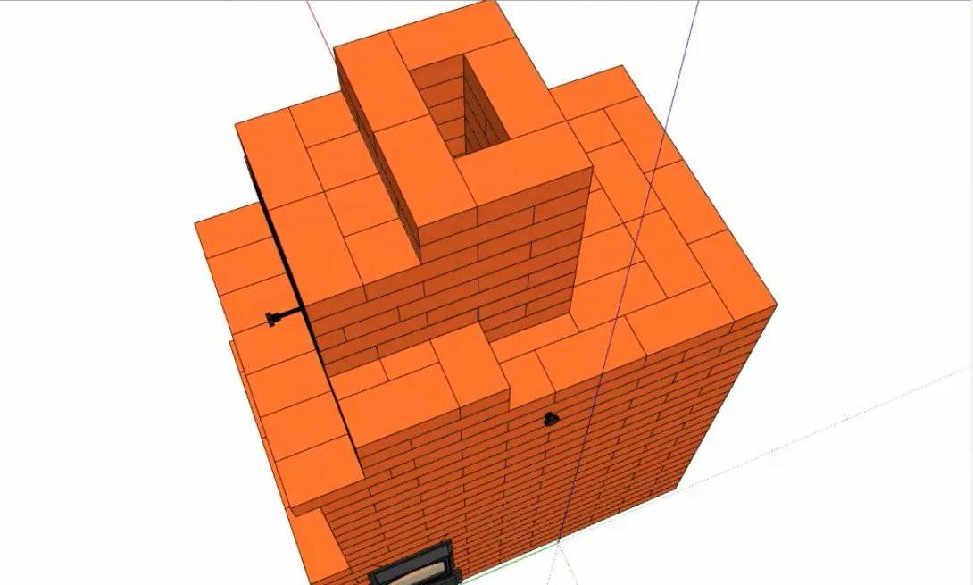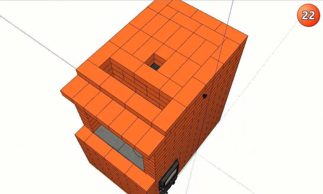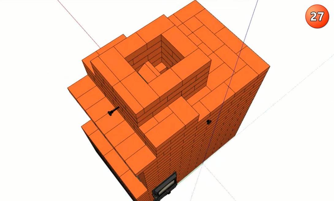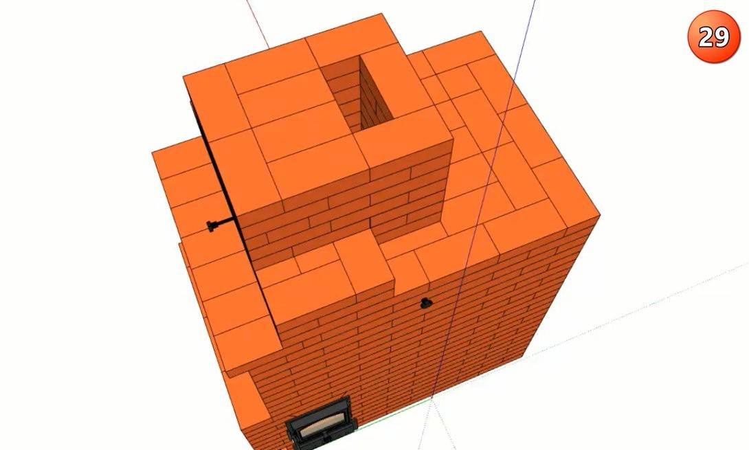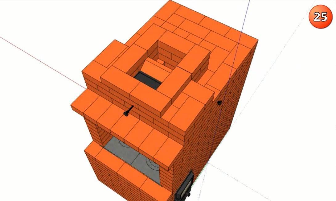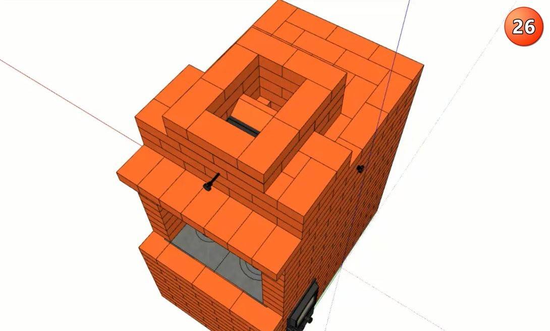 Последний этап – кладка дымовой трубы камина. Просвет трубы сужают до одного кирпича и перекрывают в 25 ряду заслонкой.