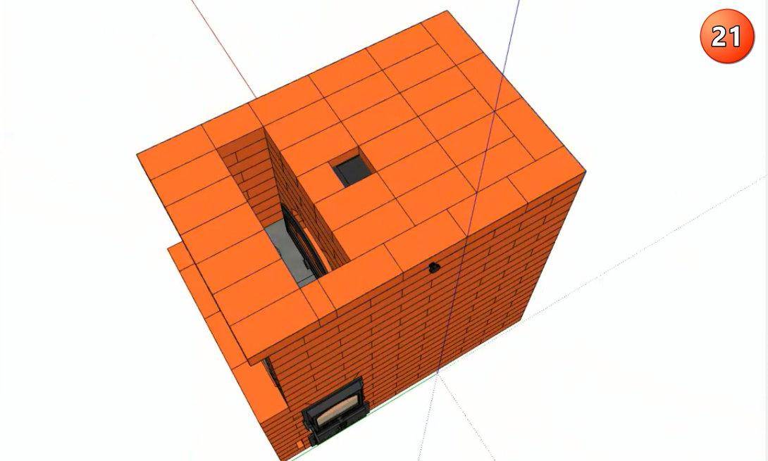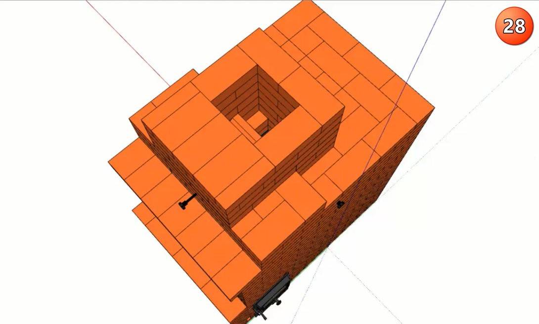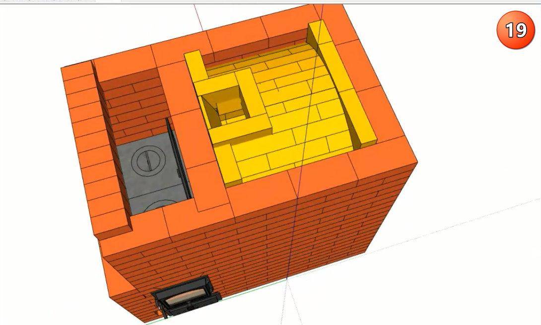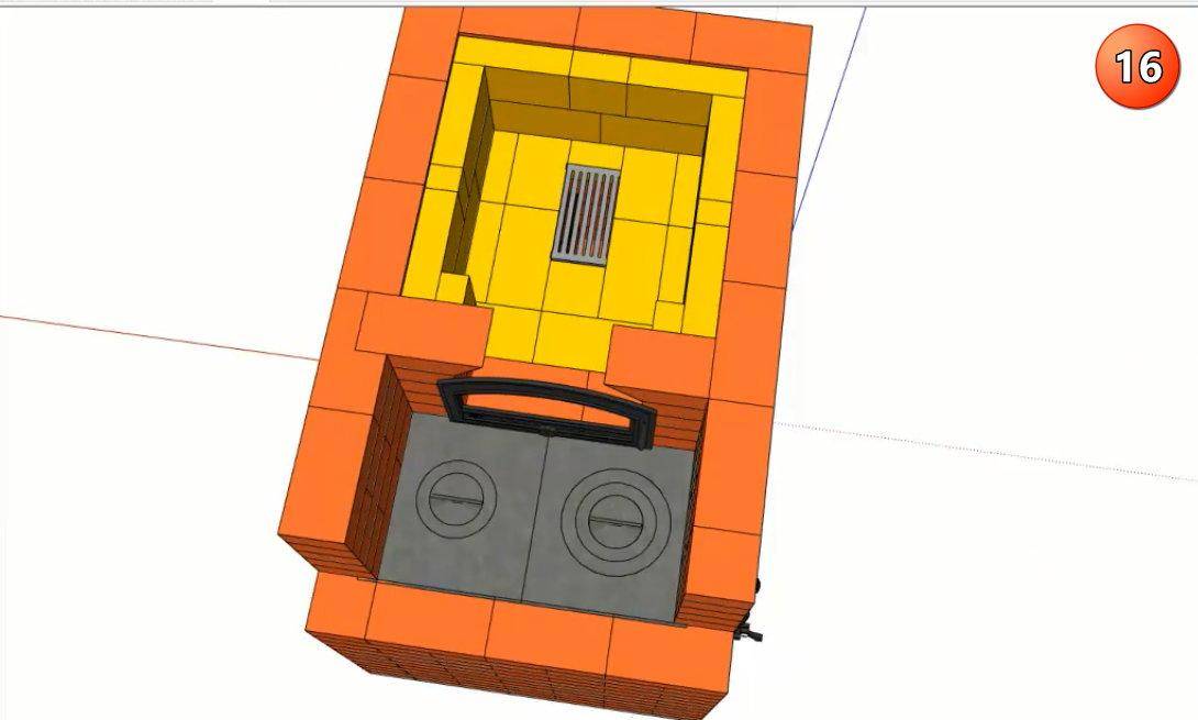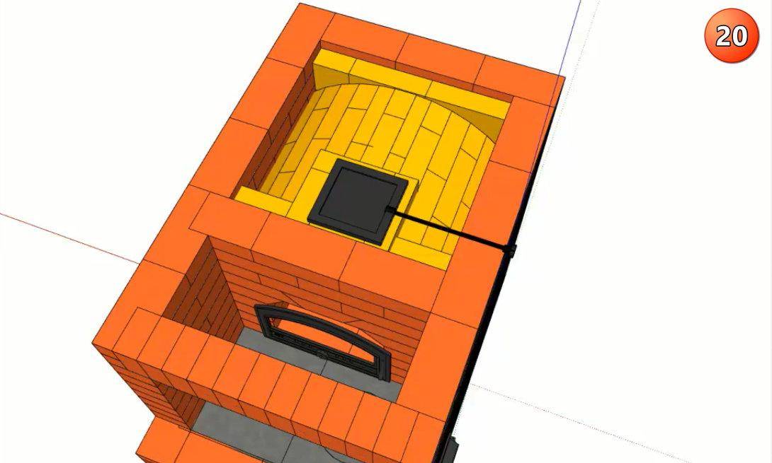 Ряды с 13 по 16 образуют свод камина и газовый зуб – выступ в его верхней передней части, препятствующий обратной тяге и попаданию дыма в комнату. Пятнадцатый ряд образует сужение дымохода, за счет которого создается повышенное давление дыма и усиленная тяга. Далее дымоход расширяется, и в 16 ряду в него встраивается прочистная дверца, через которую удаляют скопившуюся сажу. Внутреннюю поверхность дымохода по-прежнему выполняют из шамотного кирпича, внешнюю – из красного керамического.