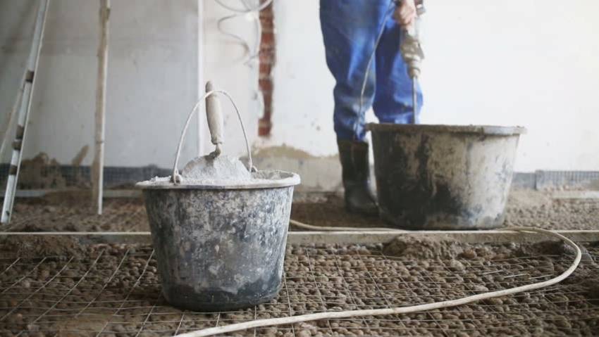 Керамзит насыпается на бетонное перекрытие и выравнивается с устройством слоя нужной толщины. Поверх керамзита выполняется стяжка толщиной 5 см с армированием сеткой из металлической или стеклопластиковой арматуры.