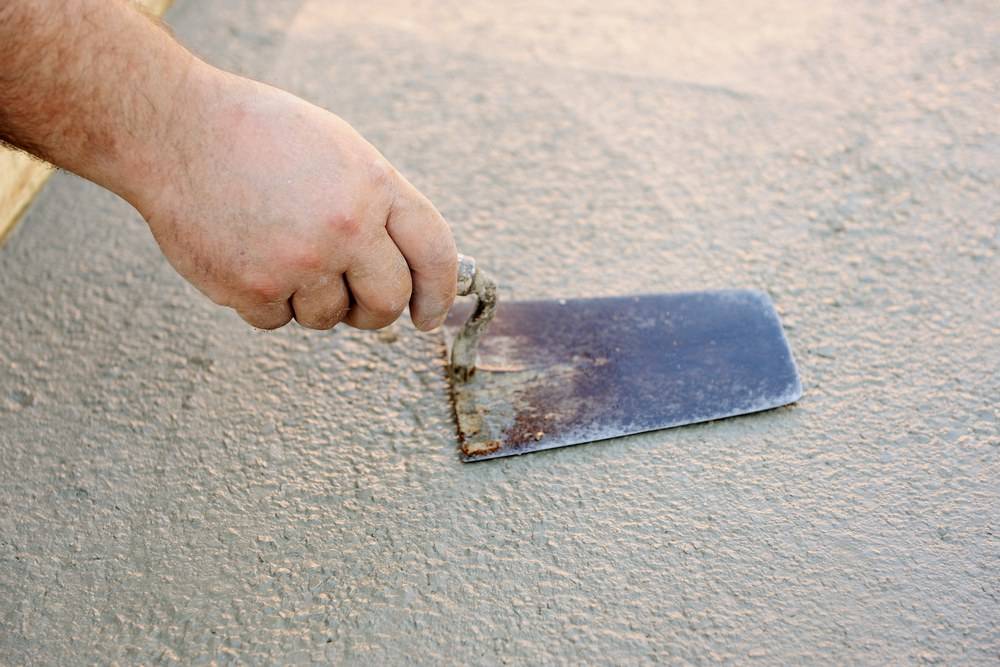 - После высыхания грунтовки все трещины и выбоины плотно заполняются цементно-песчаным раствором. Широкие щели между плитой и стенами можно заполнить герметиком или монтажной пеной.