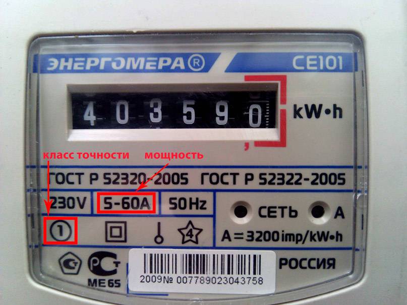 Примерное расположение маркировок класса точности и мощности на панели электросчетчика