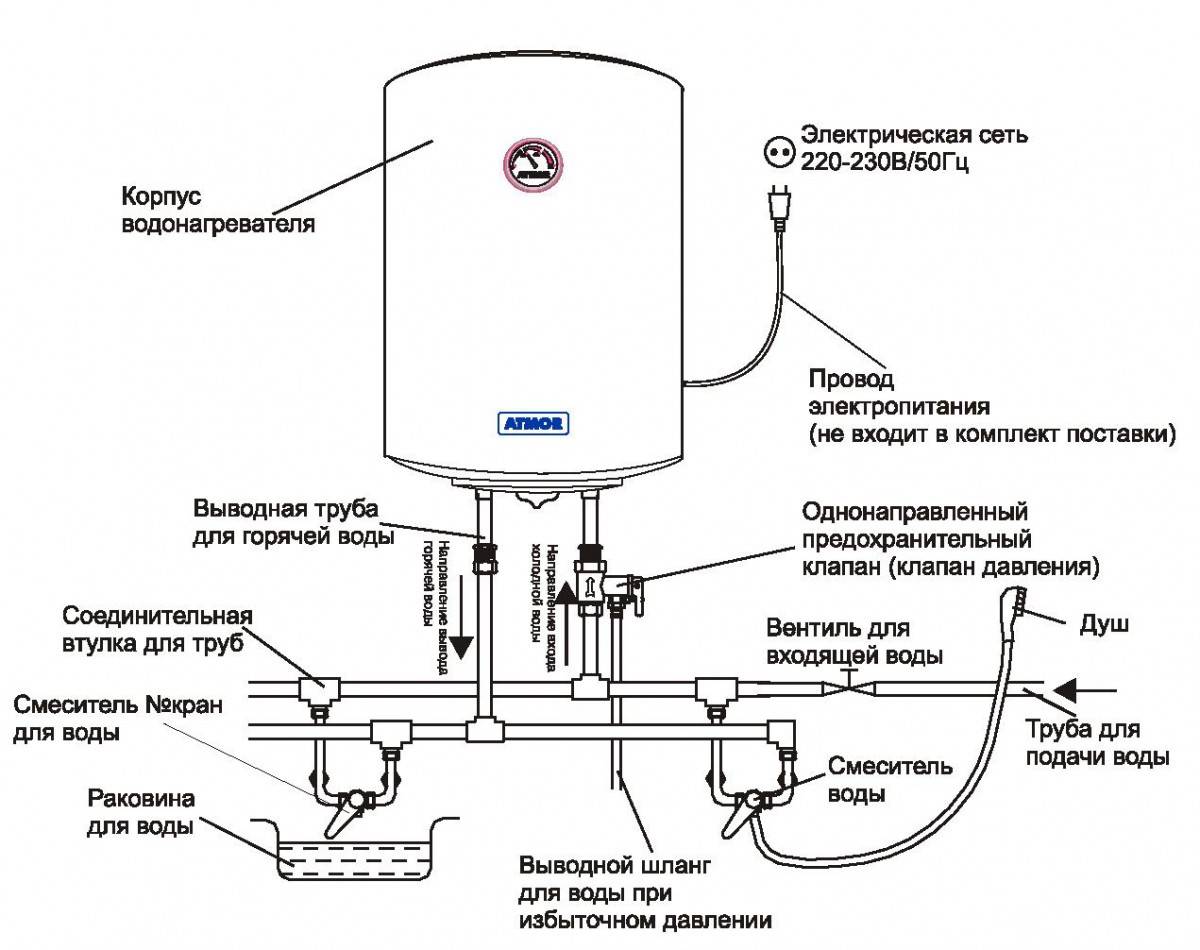 На кран, который предназначен для холодной воды, подсоединяется обратный клапан — он будет препятствовать выходу холодной жидкости обратно. На горячий кран устанавливается предохранительный клапан. Он выполняет защитные функции: предотвращает разгерметизацию резервуара с водой из-за давления, выпускает излишек жидкости, поскольку при нагреве вода увеличивает свой объем на 2-3%. Также он позволяет слить воду для демонтажа конструкции.