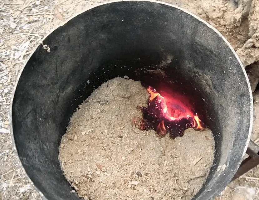 При использовании подтесанных шамотных кирпичей, оставшиеся полости заполняют песком. Если для футеровки используется только песок, его просеивают от крупного мусора и засыпают слоями – каждый примерно на 1/7 высоты трубы. Каждый слой плотно трамбуют и сбрызгивают водой, чтобы образовалась корка. Засыпку необходимо просушить в течение недели, а затем замазать торец слоем печной глины. Затем продолжается постройка ракетной печи своими руками по чертежам.