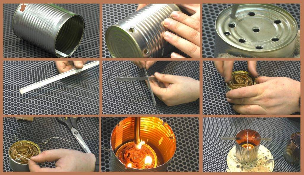 Компактный самодельный обогреватель готов. При использовании верхняя банка разогревается почти докрасна. Исходящего тепла более чем достаточно для обогрева небольшой палатки. Также можно использовать получившуюся конструкцию для приготовления пищи. Для этого нужно вместо верхней банки установить подставку из алюминиевых полос.
