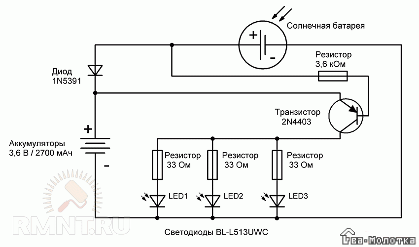 Для сборки такой схемы не обязательно иметь текстолитовую основу и вытравливать дорожки. Катоды (короткая ножка) всех светодиодов собираются в один узел, к анодам (длинная ножка) припаиваются резисторы на 33 Ом. Хвосты резисторов также спаиваются вместе и припаиваются к коллектору транзистора. С базой транзистора соединен резистор на 3,6 кОм, а с эмиттером — катод выпрямительного диода. Анод диода соединен с резистором базы, на этот же узел подается положительный полюс солнечных модулей. Минус от модулей и аккумулятора соединен проводами с объединенными катодами светодиодов. Положительный полюс аккумулятора подключается к эмиттеру транзистора.