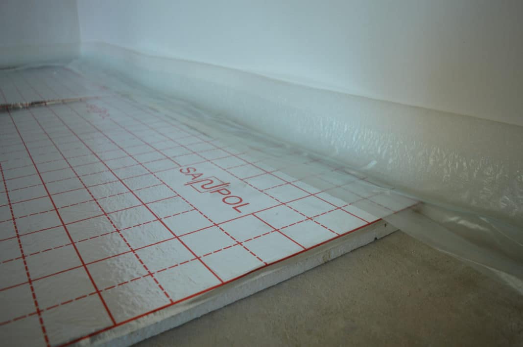 Плиты из полистирола требуют аналогичного подхода к монтажу. Основание также хорошо подготавливают, вычищают от мусора, выравнивают, устанавливают поверх гидроизоляцию. При этом рубероид кладётся в 2 слоя. По периметру обкладывается демпферная лента, размещаются теплоизоляционные маты с бобышками, имеющими светоотражающее основание. Монтаж производится по схеме в пазы между бобышками. При подключении проверяется работа системы и отсутствие в ней течи. По установленным маячкам заливают стяжку. Не забывают при этом выполнять небольшой уклон по направлению к стоку. После затвердевания бетона на поверхность стелют покрытие.