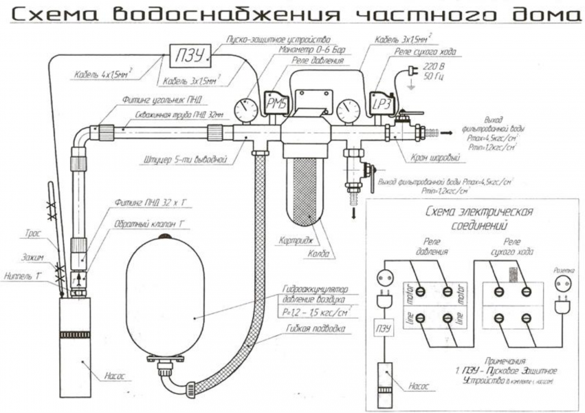 Автономная система водоснабжения из скважины загородного поместья или дачи требует автоматизации включения погружного насоса и поддержания давления в трубах, вследствие чего система должна предусматривать устройство следующих последовательно установленных элементов: