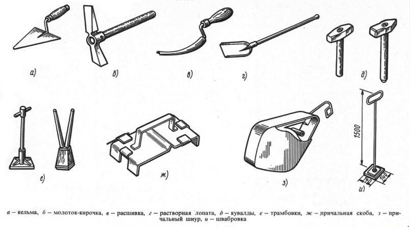 Для строительства потребуется следующий инструмент: совковая лопата, строительный уровень, рулетка, метр, угольник, кельма, кирка-молоток, расшивка, болгарка.