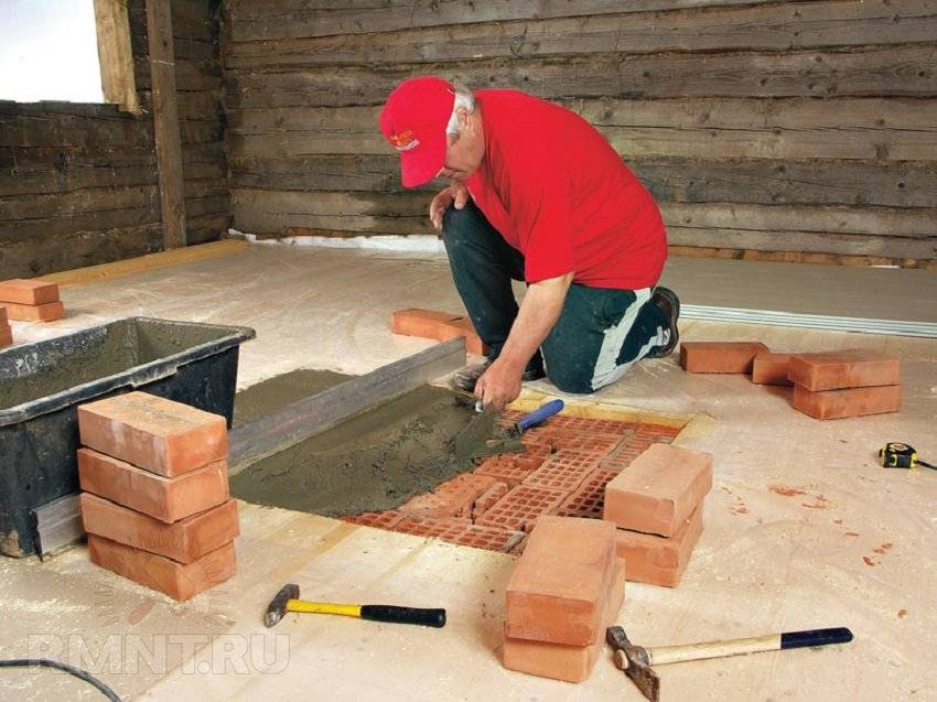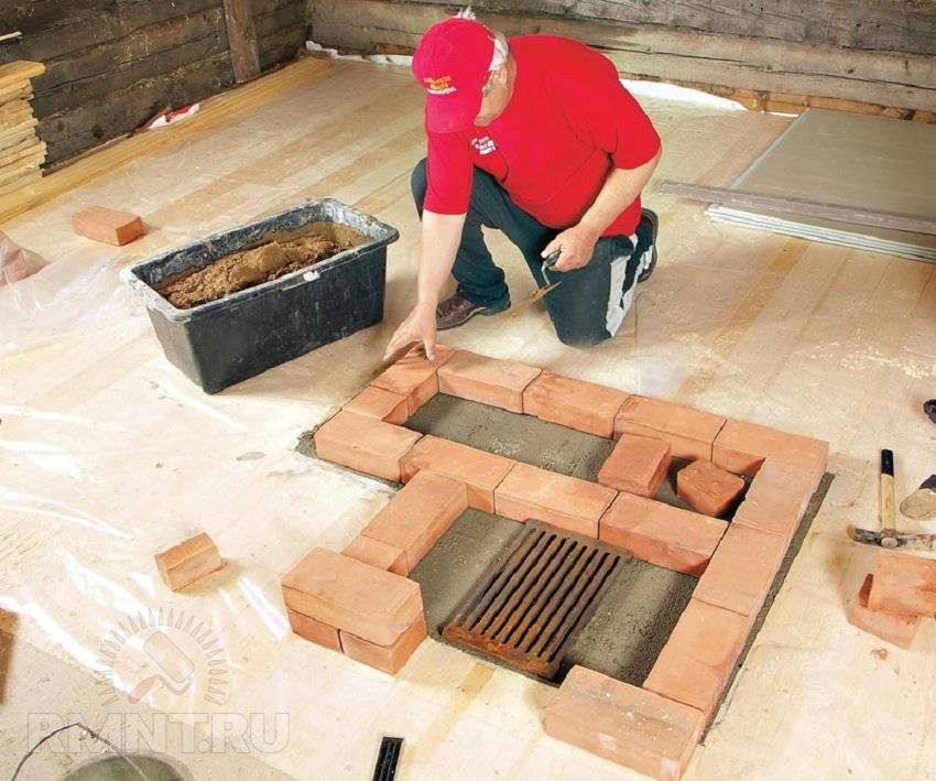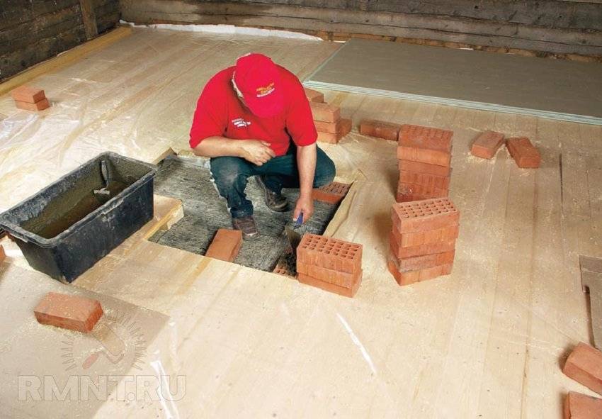 - Отверстие в полу прорезается из такого расчёта, чтобы было удобно делать печную кладку. А после завершения работы — нарастить половое покрытие непосредственно к корпусу печи и установить плинтуса. Для этого добавляют как минимум две дополнительные лаги, на которые опираются края полов. Обычно их делают из строительного бруса (50х75 мм и выше) и крепят к неразрезанным половицам саморезами. Лаги располагают вдоль стен печи после того, как закончены работы над фундаментом.