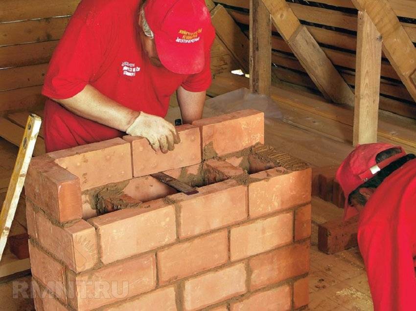 Возведение дымовой трубы осуществляется в соответствии с планом, и на первых этапах должно быть предусмотрено отсутствие прикосновения её с деревянными потолочными несущими конструкциями.