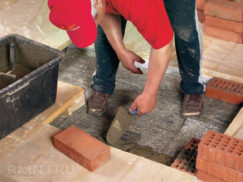 Первый ряд – выравнивающий, укладывается на цементный раствор на заранее устеленный кусок рубероида или другого аналога. После начинают укладку по схеме и в соответствии с проектом.