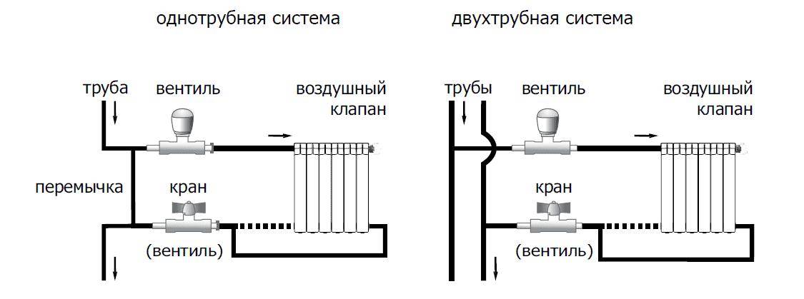 При однотрубной системе вода через радиаторы проходит один за другим и потом возвращается в отопительный котел, а при двухтрубной в каждый радиатор вода поступает отдельно из магистрали и потом туда же возвращается.