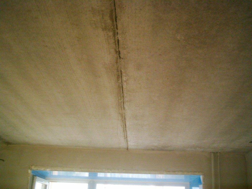 Если в перекрытиях имеются сквозные щели или трещины, а также глубокие выемки, их нужно заделать раствором до обработки потолка грунтовкой.